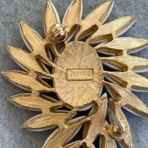 Vintage Crown Trifari White Milk Glass Navette Brooch Gold Tone Swirl Sunburst