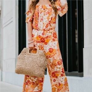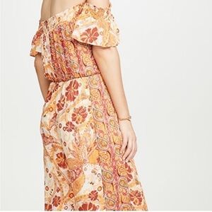 Free People Carmen Vibrant Orange Boho print off the shoulder Wide Leg Jumpsuit