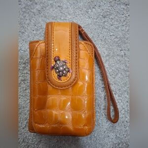 Brighton orange wristlet with a crocodile pattern, perfect for adding a pop of color to any outfit. Features a unique turtle embellishment for a touch of charm. 5x3.5