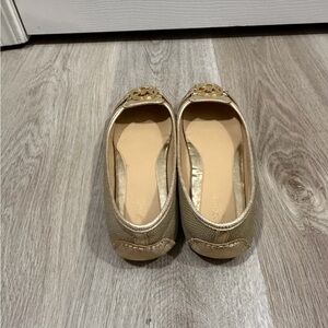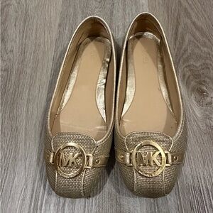 Chic metallic gold flats with signature MK logo. Stylish and versatile for any outfit.