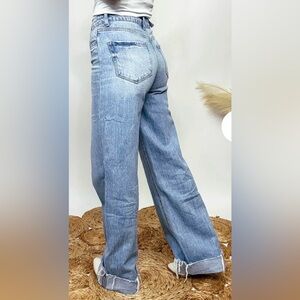 Step into super trendy style with the Kris Baggy Wide Leg Vervet by Flying Monkey Jeans. These jeans feature a baggy wide-leg silhouette with a chic cuffed hem, perfect for adding a touch of effortless cool to your wardrobe. Designed with a full-length fit, they offer a versatile and comfortable look for any occasion.