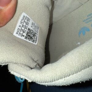 Adidas sneakers with light blue accents and laces. Cream base with a classic design.