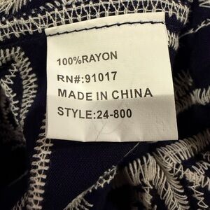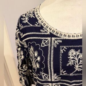Stylish navy blouse with white floral patterns. Perfect for casual or dressy occasions.