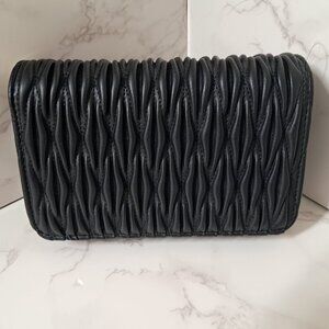 Elegant black crossbody bag. Features gold chain strap and logo detail. Perfect for any occasion.