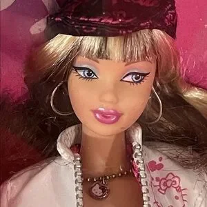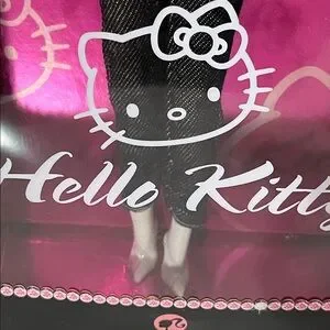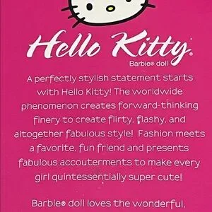 Barbie doll loves the wonderful whimsical world of Hello Kitty! Dressed in a Hello Kitty outfit featuring iconic necklace, purse, and belt. Barbie is delightfully attired for all the hippest hot spots!