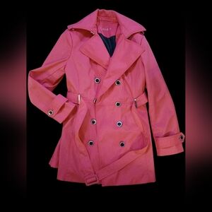 CALVIN KLEIN Trench Coat. Stylish hot pink !! Womens. Double-breasted button closure with belted waist & black & silver button details as pictured. Size tags have been removed but it fits me and I wear a medium. It appears to be a medium but I cannot guarantee that. Please request additional measurements if you desire to purchase this item. Measurements are pictured for your reference. Back has beautiful pleating as pictured. Shoulders have flaps with silver and black buttons as pictured. Inside is fully lined. Coat is lightweight and could be worn up til cool spring days. I love the classy look of this coat. There are two blemishes where the tags have been removed as pictured but does not affect wear or appearance of the coat. This is a must have to add to your classy wardrobe. I wanted to keep this one for myself ladies !! In excellent condition.