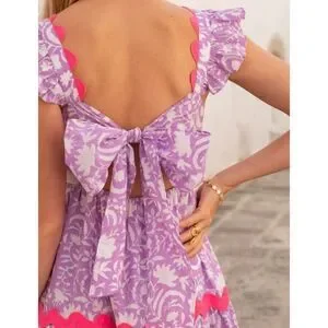 This stunning Xanthe dress features a hand-block printed Lilac Begonia floral pattern in a dreamy purple and white palette. Designed with a flattering square neckline, ruffle straps, and a tiered skirt, it is finished with vibrant pink rickrack trim for a playful touch. Perfect for garden parties, weddings, or vacations, this 100% cotton dress includes side seam pockets and a comfortable smocked back panel for the perfect fit.