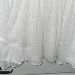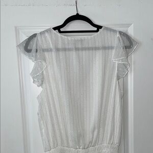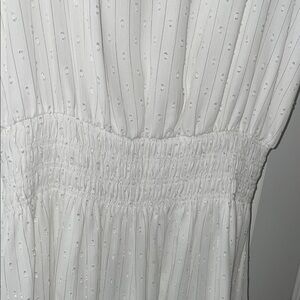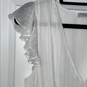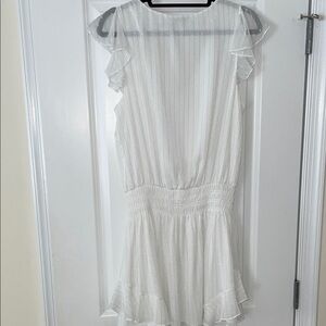 Elegant white dress with ruffle sleeves. Features a V-neck and cinched waist. Perfect for any occasion.