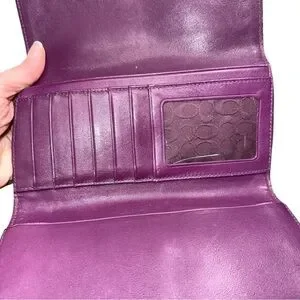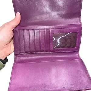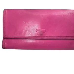 Chic Coach wallet in vibrant fuchsia leather. Ideal for adding flair to your look.