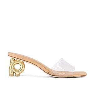 Cult Gaia Cora sandal in clear with sculptural gold heel.