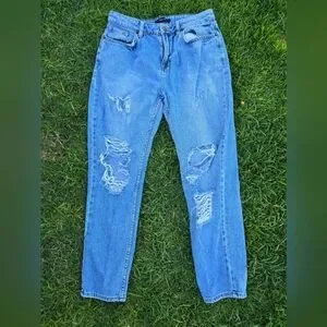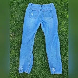 Stylish men's distressed jeans in a classic blue color. Perfect for a casual, trendy look.