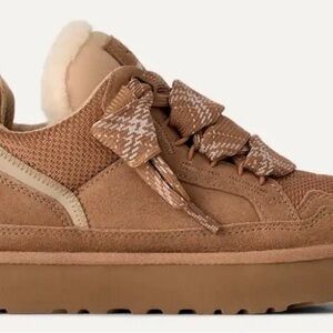 Cozy UGG shoes in chestnut suede. Features padded laces and plush lining.