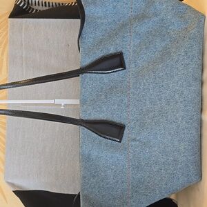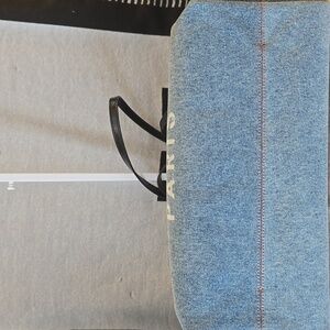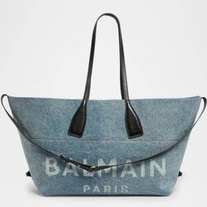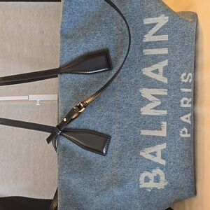 Authentic Balmain track leather-trimmed denim tote bag. no call outs, like new.