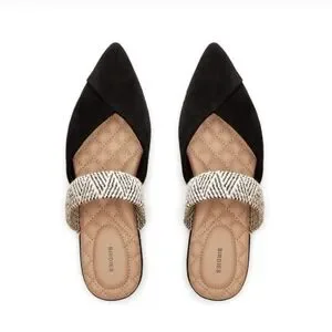 Chic pointed mules with a stylish pattern. Black upper with cream accents. Ideal for any occasion.
