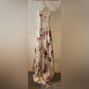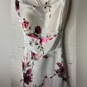 Elegant B Darlin prom dress. Features a floral pattern. Spaghetti straps and flowing skirt.