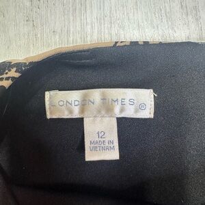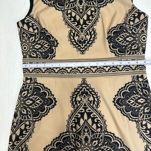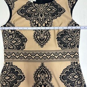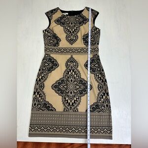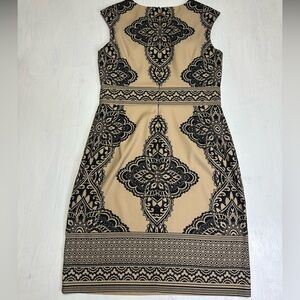 London Times Sheath Dress Size 12 Tan Black Medallion Print Stretch
