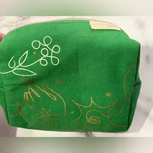 Vibrant green pouch with unique artistic design. Ideal for beauty essentials.