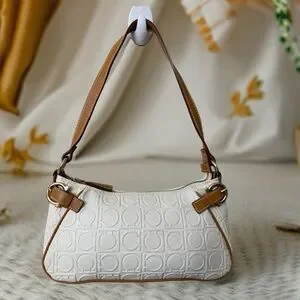 Chic shoulder bag with embossed design. Features white and tan colors. Stylish and versatile.