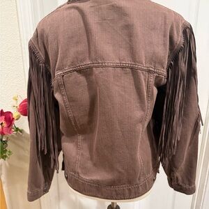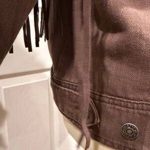 Stylish chocolate jean jacket with playful fringe details. Perfect for a boho vibe.