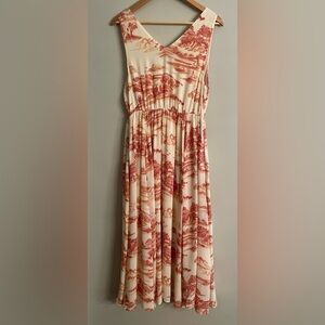 Lovely bra-friendly 100% viscose midi in a muted pink-ish toile design. Toile is quite stylized vs sharp.