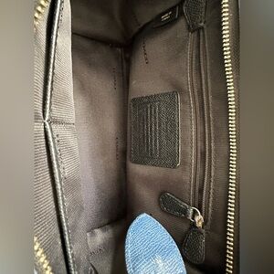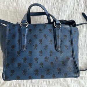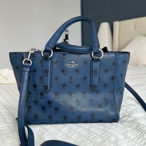 Elegant blue Coach satchel with black floral accents. Features dual handles and a detachable strap,in good condition only the bottom corners of the bag show some wear.