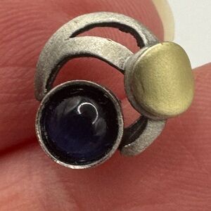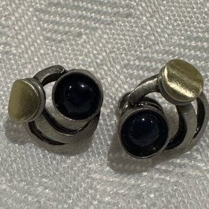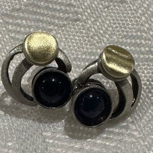 Christophe Poly geometric two-tone earrings featuring a blue circle glass stone set in matte sterling silver with a gold-tone accent