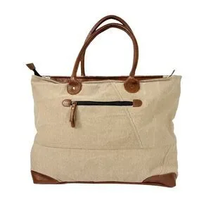 This Mona B weekender tote bag features a vibrant upcycled carpet print on one side and a minimalist tan canvas on the reverse. Crafted with eco-friendly materials, it includes a recycled plastic bottle lining and vegan leather trim. The extra large interior offers multiple pockets and a secure zipper closure. Perfect for travel, overnight trips, or heavy daily use, this bag combines bohemian style with sustainable fashion.