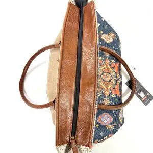 NWT Mona B Women XL Weekender Tote Blue Tan Upcycled Canvas Boho Carpet Print