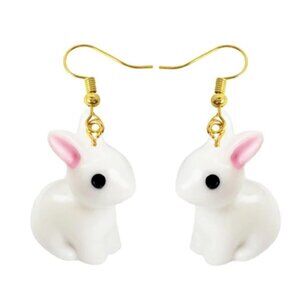 Tiny white rabbits on a drop hook. Gold-tone hardware. Bunnies measure approximately 1" high. Made of plastic resin. Brand new.