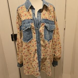 BiBi Blue Floral Denim Oversized Button Up Shirt Rustic