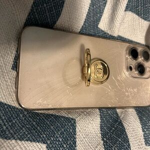 Stylish gold phone holder with CHANEL emblem. Perfect accessory for phone