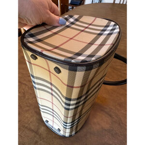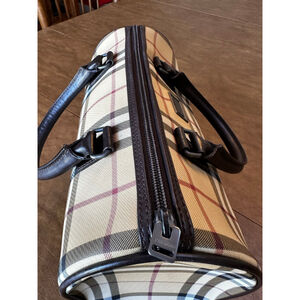 This pre-owned Burberry satchel features the brand's iconic Nova Check plaid pattern in beige, brown, black, and red. The bag has a cylindrical shape with dark brown leather handles and trim. It closes with a top zipper, which has a "BURBERRY" engraved pull. A rectangular metal plaque with "BURBERRY" is affixed to the front. The interior is lined with brown fabric featuring repeated "BURBERRY" branding. The bottom of the bag has four protective metal feet. Very minor signs of wear.