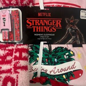 Cozy pink sleepwear set featuring Stranger Things theme. Includes top and socks.