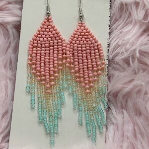 Description: Pretty pink handmade fringe earrings with cream and aqua ombre tips. Soft and feminine.
