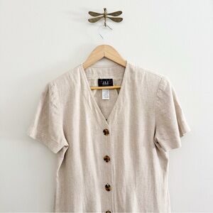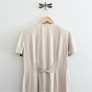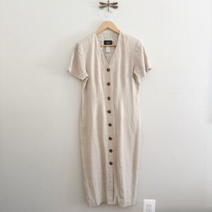 Vintage Linen Blend Neutral Minimalist V Neck Button Down Midi Dress