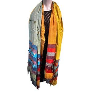 This vibrant handwoven scarf showcases intricate multicolor patterns with loop embellishments and fringe. Crafted from cotton, it offers a lightweight, breathable accessory suitable for layering or standalone wear.