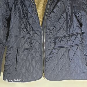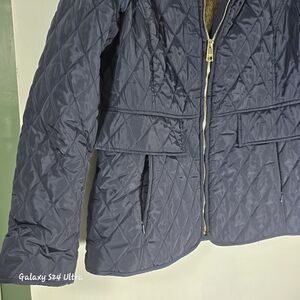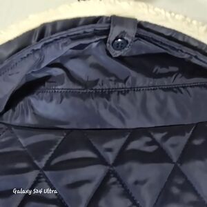 Chic navy puffer with quilted design. Features a soft cream collar. Ideal for warmth and style.