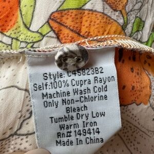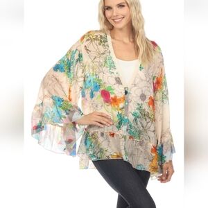 RARE Sequence Georgina Kimono style blouse by Johnny Was. Beautiful, vibrant floral print of orange, blue, pinks on nude, peach background.