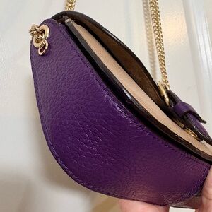 This Coach Kleo Crossbody (Style C5993) features a gorgeous mix of Taupe, Electric Purple, and Ochre (yellow) in premium polished pebble leather. It’s the sleek, modern sister to the famous Coach Beat bag!