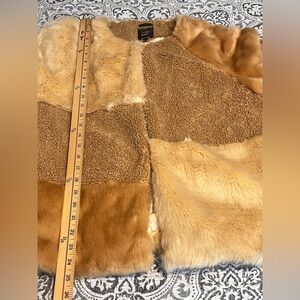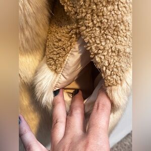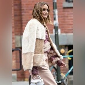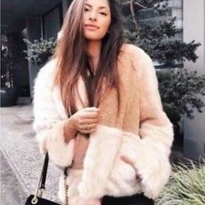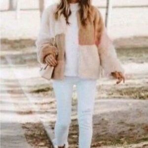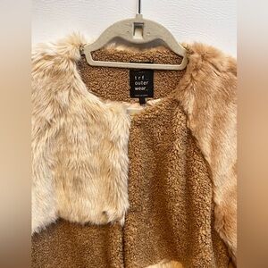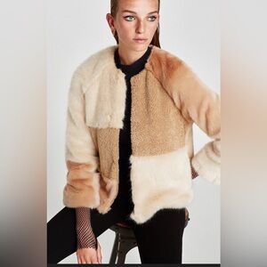 Stay warm and stylish with this luxurious cream and tan faux fur jacket. Perfect for adding a touch of elegance to any outfit.