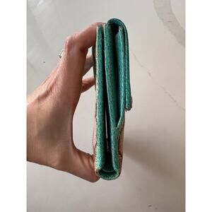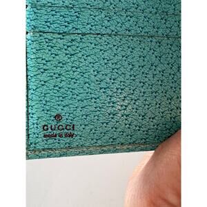 This GG monogram canvas wallet features rich brown logo canvas paired with vibrant turquoise leather trim and a sculptural bamboo accent closure. The contrast edging gives it a fresh, unexpected twist while still feeling unmistakably Gucci.