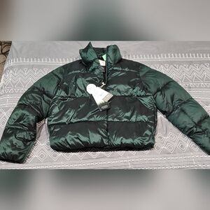 Brand new with tags. Size XS. Shiny Aspen green in color. Zip up closure. Relaxed fit designed to leave room for your extra layers. High neck. Side pockets. Pocket on arm. Logo circle on left arm. On the inside there's a zipper pocket and another side pocket. Water resistant. Measurements and fabric content listed above in pictures.