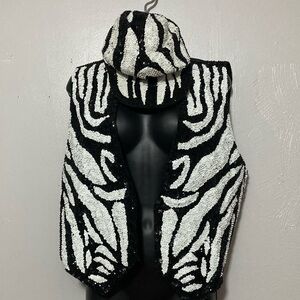 Vintage Beaded & Sequin Zebra Print 90s Vest w/ Matching Beaded Hat Maximalism