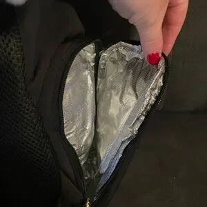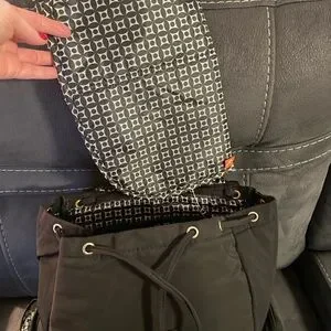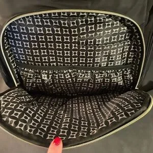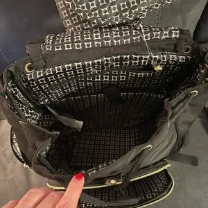 Elegant diaper black backpack with quilted design. Features multiple zippered compartments. Ideal for daily use.