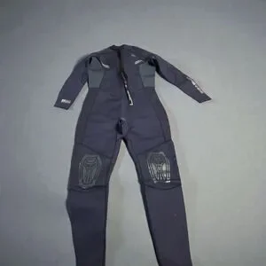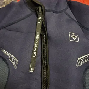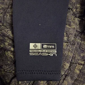 This is a men's SEASKIN full-body wetsuit, size L, in navy blue with gray accents. It features a front zipper closure and reinforced knee pads with a textured pattern. The material composition is 90% Neoprene and 10% Nylon, indicating it's a 2mm "Recyclable Series" wetsuit. The SEASKIN logo is visible on the left sleeve, zipper pull, and various other locations.