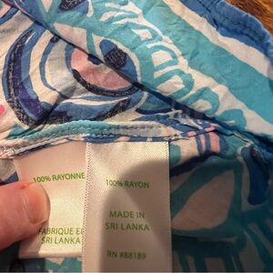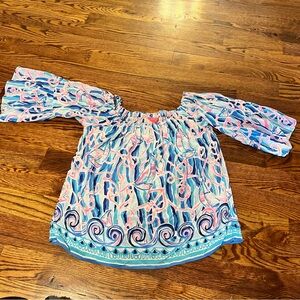 Lilly Pulitzer Off Shoulder Blouse Size L | Blue Pink Print | 100% Rayon
