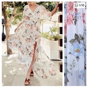 Baltic Born floral maxi dress in a romantic white, pink, and blue color palette. This elegant gown features a surplice wrap-style neckline and flutter kimono sleeves for a graceful silhouette. An elasticized waist provides a comfortable and flattering fit, while the flowing skirt includes a side slit for ease of movement.