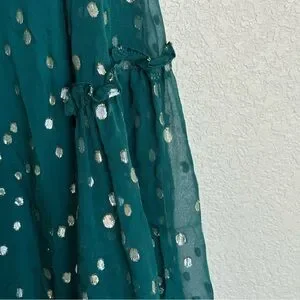 Cleme long-sleeve silk dress in spruce green with gold metallic dot pattern, pleated front detail, sheer balloon sleeves with tie accents, back zip closure, fully lined body, flowy silhouette.