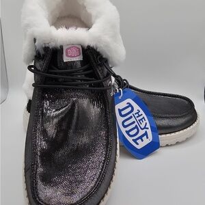 Elevate your cozy style with these stunning metallic black Hey Dudes. Features a chic shimmering textile upper paired with a plush white faux shearling collar and lining for ultimate warmth.