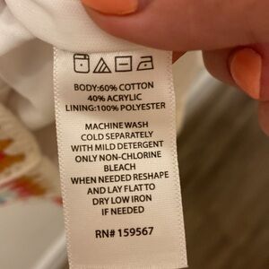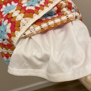 Mini sleeveless crocheted dress. Colors are pink, blue, rust and cream and the dress is fully lined. Tag has been taken off.